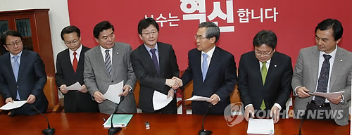 | △ '김영란법' 처리 합의 악수하는 여야 원내대표 (서울=연합뉴스) 이상학 기자 = 새누리당 유승민 원내대표와 새정치민주연합 우윤근 원내대표 등이 2일 오후 국회에서 김영란법(부정청탁 및 금품 등 수수금지법) 본회의 처리 등에 합의한 뒤 악수를 하고 있다.왼쪽부터 새누리당 이종훈 의원, 새누리당 조해진 원내수석부대표, 새누리당 원유철 정책위의장, 새누리당 유승민 원내대표, 새정치민주연합 우윤근 원내내표, 새정치민주연합 강기정 정책위의장, 새정치민주연합 안규백 원내수석부대표. |
