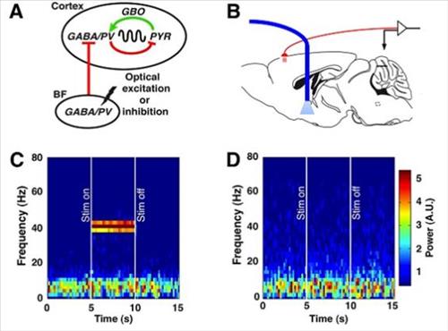 | △ 기저전뇌 파브알부민 신경세포와 대뇌피질 간의 뇌회로 모식도(A) : 기저전뇌의 파브알부민 신경세포(BF)는 대뇌피질(Cortex)의 억제성 뇌세포에 직접 연결돼 반복적인 억제성 신호를 통해 감마파 진동을 유발. 초록색 선은 흥분성 신호, 빨간색 선은 억제성 신호. 광유전학적 실험 디자인(B) : 기저전뇌의 파브알부민 신경세포에, 빛에 반응하는 특수단백질인 채널로돕신(ChR2)을 발현시킨 후, 광케이블로 전달된(파란색 선) 레이저로 자극하고(하늘색 세모), 이 반응을 뇌파로 측정(빨간색 선). (C)는 채널로돕신(ChR2)이 발현된 파브알부민 신경세포가 40Hz의 빛으로 자극될 때 뇌파에서 40Hz의 에너지가 증가(붉은색 계열) 되는 모습. (D)는 채널로돕신(ChR2)이 발현되지 않은 대조군 생쥐에서는 레이저를 비추어도 뇌파에 아무런 반응이 없는 모습. |