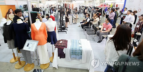 | △ 대한민국 섬유 교역전 개최 (서울=연합뉴스) 홍해인 기자 = 3일 서울 삼성동 코엑스에서 '2014 대한민국 섬유교역전, 프리뷰 인 서울 2014'가 열리고 있다. 대한민국 섬유 교역전은 섬유제품에 대한 홍보강화, 수출증대를 목적으로 매년 가을 서울에서 개최되는 국제 섬유소재 전문전시회다. 2014.9.3 hihong@yna.co.kr |
