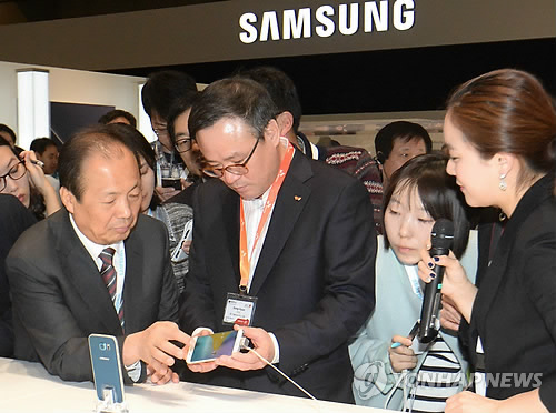 | △ 설명듣는 장동현사장 (바르셀로나 사진공동취재단=연합뉴스) SK텔레콤 장동현사장이 2일 오후(한국시간) 스페인 바르셀로나에서 열리는 '모바일 월드 콩그레스 (MWC) 2015 '에서 삼성전자 부스를 방문 신종균 사장으로 부터 설명을 듣고 있다. 2015.3.2 photo@yna.co.kr |