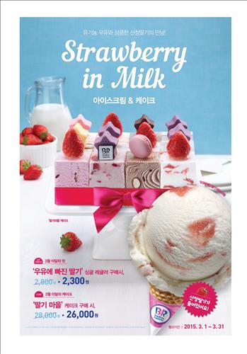 배스킨라빈스는 신제품 출시를 기념해 3월 한달동안 우유에 빠진 딸기(싱글레귤러)와 딸기마을을 각각 500원, 2천원 할인 판매한다.