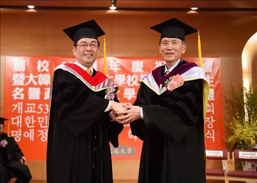 | △ 박재규 경남대학교 총장(오른쪽)이 지난 1일 중국문화대학에서 장징후 이사장으로부터 명예 박사학위를 받고 있다.<<경남대학교 제공>> |