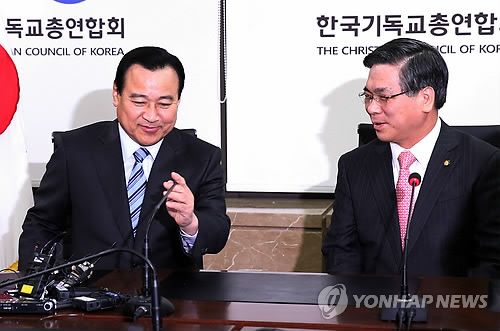 | △ 이 총리, 한국기독교총연합회 예방 (서울=연합뉴스) 전수영 기자 = 이완구 국무총리가 3일 오후 서울 연지동 이영훈 한국기독교총연합회장을 예방해 환담하고 있다. |