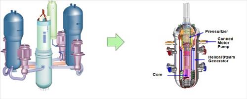 | △ 기존 대형원전(왼쪽)과 SMART 원전 비교. SMART는 원자로의 주요계통 기기를 많은 관으로 연결한 기존 대형원전과 달리 주요 기기를 압력용기 안에 배치해 안전성을 크게 높였다. |