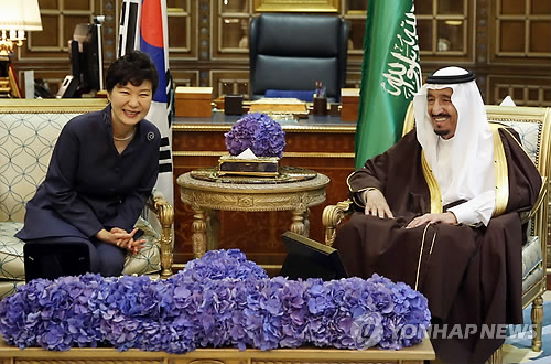 | △ 한·사우디 정상회담 (리야드=연합뉴스) 이정훈 기자 = 박근혜 대통령이 3일 오후(현지시간) 사우디아라비아 리야드 에르가궁 국왕집무실에서 살만 빈 압둘아지즈 알 사우드 국왕과 정상회담을 하고 있다. |