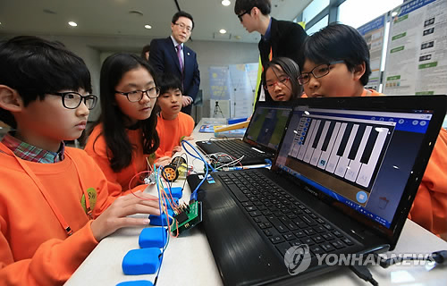 | △ 지난달 5일 오전 서울 관악구 봉천동 서울시과학전시관에서 열린 '소프트웨어(SW) 창의캠프'에 참가한 어린이들이 전도체를 이용한 피아노 연주 프로그램으로 컴퓨터와 현실세계가 서로 상호작용 하는 피지컬 컴퓨팅 체험을 하고 있다. |