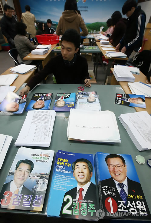 | △ 전국동시조합장 선거 공보 발송 (수원=연합뉴스) 신영근 기자 = 오는 11일 실시되는 제1회 전국동시조합장 선거를 앞두고 2일 오전 경기도 수원시 팔달구선거관리위원회에서 선관위 직원들이 조합장 후보자들의 선거 공보물을 발송하고 있다. 2015.3.2 drops@yna.co.kr http://blog.yonhapnews.co.kr/geenang |