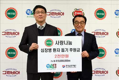 (서울=연합뉴스) 최이락 기자 = 베지밀을 생산·판매하는 정식품은 지난 3일 한국심장재단에 심장병 환자를 돕기 위한 사랑나눔 후원금 2천만원을 전달했다고 4일 밝혔다.