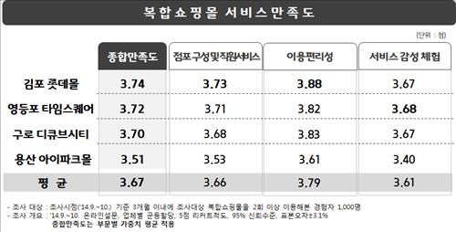 업체별 종합만족도는 김포 롯데몰이 3.74점이었고 이어 영등포 타임스퀘어(3.72점), 구로 디큐브시티(3.7점), 용산 아이파크몰(3.51점) 순이었다.