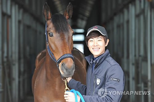 | △ 새롭게 도전하는 꼴지마 '차밍걸' (서울=연합뉴스) 101전 전패란 한국경마 최다연패기록을 세우고 2013년 9월 은퇴한 경주마 '차밍걸'이 19일 경북 상주 국제 승마장에서 열리는 2014년 전국 국산마승마대회 장애물경기에 경기용 승용마로 첫 데뷔전을 갖는다. 지난 18일 차밍걸이 경기도 화성시 궁평목장 실내승마연습장에서 류은식 선수와 함께있다. 2014.7.19 << 한국마사회 제공 >> photo@yna.co.kr |