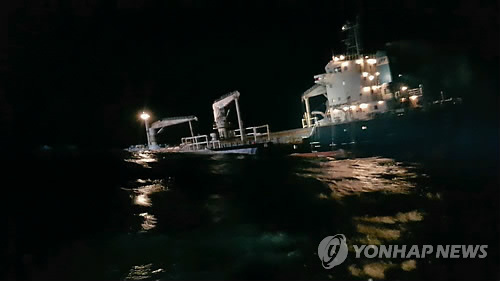 (군산=연합뉴스) 백도인 기자 = 4일 오후 11시15분께 전북 군산시 어청도 서쪽 15km 해상에서 홍콩 선적 4천400t급 화물선이 모래 운반선을 추돌했다.