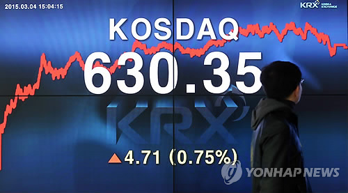 | △ 코스닥, 630 돌파 (서울=연합뉴스) 신준희 기자 = 4일 오후 서울 여의도 한국거래소 전광판에 코스닥지수 630.35가 표시돼 있다. 코스닥지수는 전날보다 4.71(0.75%)포인트 오른 630.35로 마감했다. 지수가 630선을 돌파한 것은 지난 2008년 6월 이후 처음이다. |