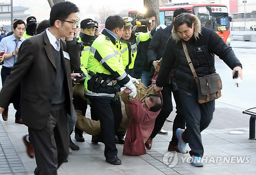 | △ 체포된 리퍼트 미 대사 습격 괴한 (서울=연합뉴스) 김주성 기자 = 5일 오전 서울 세종문화회관에서 열린 민화협 주최 초청 강연에서 마크 리퍼트 주한 미국대사를 습격한 용의자가 경찰에 체포돼 끌려가고 있다. 2015.3.5 utzza@yna.co.kr |