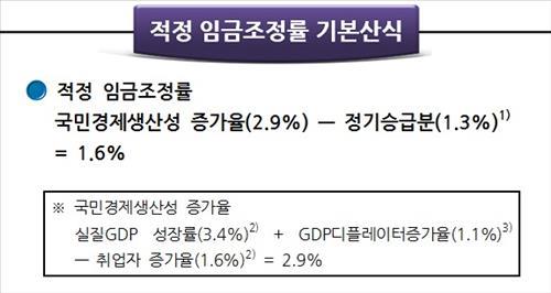 경총은 국민경제생산성 증가율 2.9%에서 정기승급분 1.3%를 제하는 산식으로 1.6%를 내놓았다.