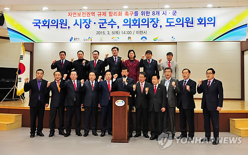 | △ 규제완화 촉구하는 경기 8개시군 대표자들 (이천=연합뉴스) 경기 8개지역 시장·군수, 국회의원, 도의원, 시군의회 의장 등이 5일 오후 이천시청에서 자연보전권역에 대한 규제완화를 촉구하고 있다. 2015.3.5 <<이천시 제공>> kcg33169@yna.co.kr |
