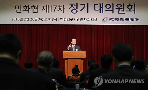 | △ 홍사덕 민족화해협력범국민협의회 대표상임의장이 지난달 26일 오후 서울 용산구 효창동 백범김구기념관 대회의실에서 열린 민화협 제17차 정기 대의원회에서 대회사를 하고 있다. |