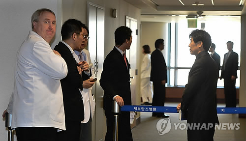 | △ 리퍼트 대사 병실앞 (서울=연합뉴스) 서명곤 기자 = 6일 오전 마크 리퍼트 주한 미국 대사가 입원 중인 서울 서대문구 세브란스병원 병실 입구에서 의료진과 경호원들이 대기하고 있다. 2015.3.6 seephoto@yna.co.kr |