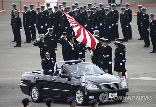 | △ 아베 신조 일본 총리가 2014년 10월 26일 자위대 창설 60주년을 기념해 26일(현지시간) 도쿄 북쪽 항공자위대 기지에서 열린 항공관열식에 참가하고 있다. (AP=연합뉴스 DB) |