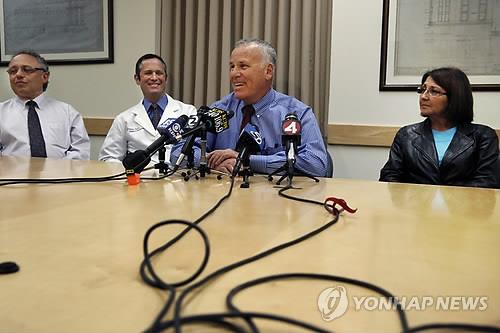 | △ 6건 연쇄 신장 이식 수술에 나선 캘리포니아 퍼시픽 메디컬 센터 의료진이 수술 하루 전날인 4일(현지시간) 기자회견을 하고 있다. 맨 오른쪽이 기적의 수술을 가능케 한 신장 기증자 줄리 브루사드. |
