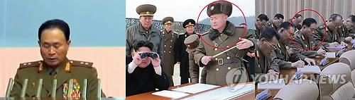 | △ '별 붙였다 뗐다만 4번'…두계급 강등된 북한 박정천 (서울=연합뉴스) 북한 김정은 체제 들어 중장(별 둘)과 상장(별 셋)을 오르내리던 박정천 부총참모장 겸 화력지휘국장이 최근 상장에서 소장(별 하나)으로 강등된 사실이 8일 확인됐다. 조선중앙TV가 지난 5일 방송한 김정은 국방위원회 제1위원장의 공개활동 기록영화에서 박정천이 소장 계급장을 달고 지난달 23일 열린 노동당 중앙군사위원회 확대회의에 참석한 모습(맨 오른쪽 사진)이 포착됐다. 김정은 체제 들어서만 중장→상장→중장→상장으로 계급이 오르락 내리락한 박정천은 이번에는 소장으로 두 계급 강등되는 수모를 겪게 됐다. 2015.3.8 nkphoto@yna.co.kr |