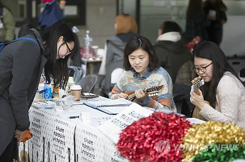 | △ '동아리 활동 기대됩니다' (서울=연합뉴스) 윤동진 기자 = 전국 대부분 대학 개강일인 2일 서울 서대문구 이화여자대학교 학생문화관에서 열린 '동아리 박람회'에서 학생들이 신입생들을 모집하기 위해 열띤 홍보를 하고 있다. 2015.3.2 mon@yna.co.kr |
