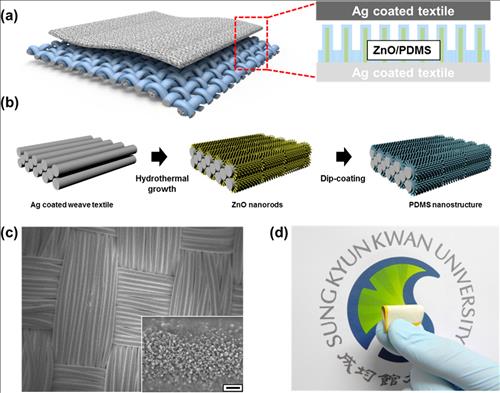 현재 상업화돼 있는 은 코팅 직물 위에 산화아연(ZnO) 나노막대를 수직배열로 합성하고 이를 실리콘 고분자물질인 PDMS로 코팅하는 방식으로 정전효과와 분극현상이 가능한 나노패턴을 구현했다.