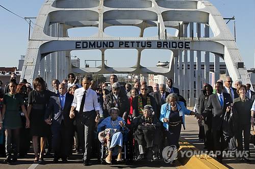 (댈러스=연합뉴스) 장현구 특파원 = 미국 흑인 참정권 운동의 상징인 '셀마 행진'의 50주년을 기념하는 행사가 미국 앨라배마 주 셀마의 에드먼드 페터스 다리에서 7일(현지시간) 열렸다.