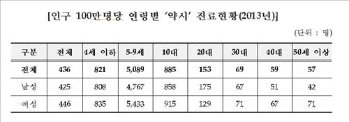 5~9세 진료 인원은 인구 100만명당 5천89명으로 전체 연령대 중 가장 많았다.