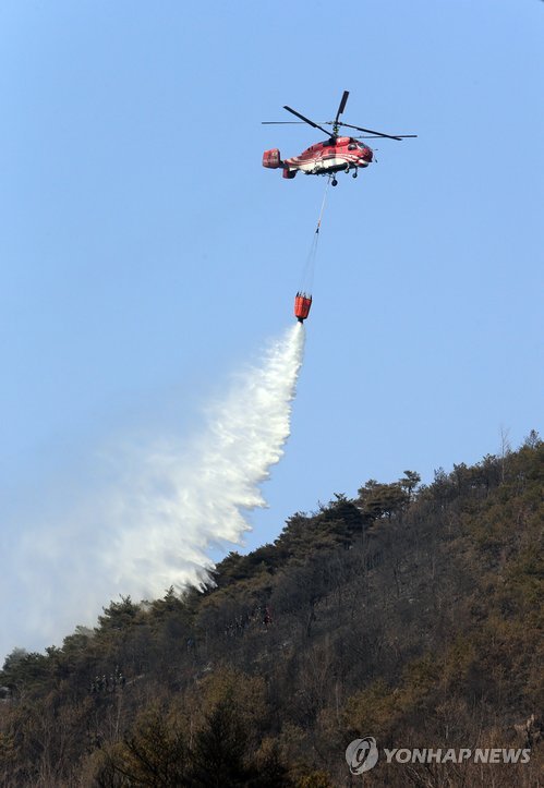 | △ 물뿌리는 헬기 (고성=연합뉴스) 이종건 기자 = 8일 강원 고성군 죽왕면 구성리에서 발생한 산불진화에 투입된 헬기가 물을 뿌리고 있다. 2015.3.8 momo@yna.co.kr |