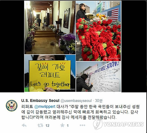 대사관 측은 관저에 답지한 화분이 줄을 지어 놓인 사진과 더불어 시민이 '같이 가요 리퍼트'라고 적힌 메시지를 든 모습, 쾌유를 기원하며 쌓인 꽃송이와 시민들이 쾌유 기원 메시지를 적는 모습 등이 담긴 연합뉴스 보도 사진 등을 함께 올렸다.