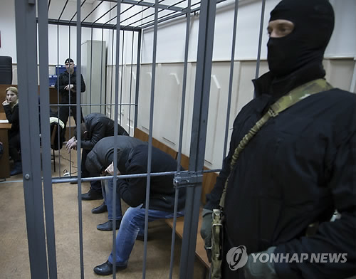 | △ 구금된 넴초프 살해 용의자들 (AP=연합뉴스) 러시아의 야권 지도자 보리스 넴초프의 살해 용의자 5명 중 3명이 8일(현지시간) 모스크바의 법원에 구금돼 감시를 받고 있다. |