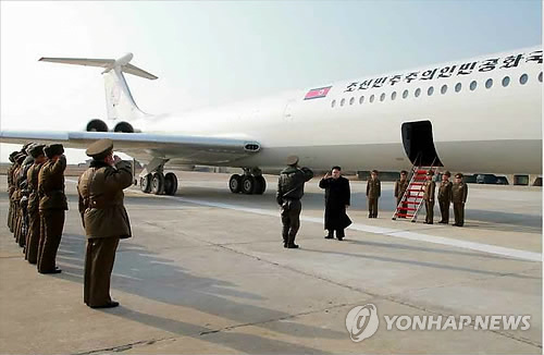 | △ 북한 김정은, 전용기 타고 공군부대 시찰 (서울=연합뉴스) 북한 김정은 국방위원회 제1위원장이 전용기를 타고 공군부대인 1016 군부대를 시찰했다고 노동신문이 9일 보도했다. 전용기에서 내린 김정은을 부대 관계자들이 맞이하고 있다. 김정은 뒤로 전용기의 모습이 보인다. 2015.3.9 nkphoto@yna.co.kr |