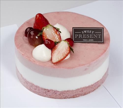 '순우유 딸기 무스'는 촉촉한 딸기 시트에 우유 무스와 딸기 무스가 어우러진 케이크로, 딸기를 장식으로 얹었다.
