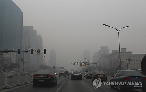 | △ 올해 1월15일 베이징(北京) 중심가 모습. 고층건물이 잿빛 스모그에 휩싸여 있다. 이날 베이징의 PM 2.5(지름 2.5㎛ 이하의 초미세 먼지) 농도는 세계보건기구(WHO) 기준치(25㎍/㎥)의 20여 배인 540㎍/㎥ 을 기록했다. (연합뉴스DB) |