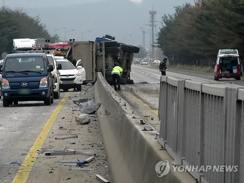 | △ 중앙고속도로 사고 (칠곡=연합뉴스) 9일 오전 경북 칠곡군 동명면 중앙고속도로에서 덤프트럭이 중앙분리대를 들이받고 넘어지면서 트럭에 실린 정원석이 반대방향으로 떨어지는 바람에 차량 10대가 연이어 들이받는 사고가 발생하자 경찰과 소방당국이 현장을 수습하고 있다. 2015.3.9 << 경북지방경찰청 >> sds123@yna.co.kr |
