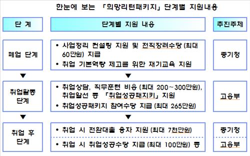 마지막 취업 후 단계에서는 중기청이 제2금융권 대출을 사용한 소상공인에게 저금리의 제1금융권 대출(대출금리 7% 고정, 대출한도 7천만원)로 전환해주고, 고용부가 취업성공수당(최대 100만원)을 지급할 계획이다.