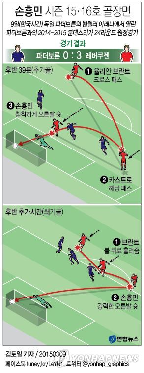 레버쿠젠의 골잡이 손흥민은 9일(한국시간) 독일 파더보른의 벤텔러 아레나에서 열린 파더보른과의 2014-2015 분데스리가 24라운드 원정경기에서 팀이 1-0으로 앞선 후반 39분 추가골과 후반 추가시간 쐐기골을 잇달아 터트렸다.