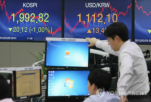 | △ 코스피, 미국 금리인상 우려에 하락 (서울=연합뉴스) 임헌정 기자 = 9일 코스피는 전 거래일보다 20.12포인트(1.00%) 내린 1,992.82로 마감했다. 이날 오후 서울 중구 을지로 외환은행 본점 딜링룸. |