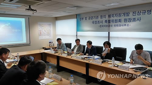 | △ 국회 자원외교 국조특위 두바이서 현장조사 (두바이=연합뉴스) 강훈상 특파원 = 국회 해외자원개발 진상규명을 위한 국정조사 특별위원회는 9일(현지시간) 오전 아랍에미리트(UAE) 두바이 한국석유공사 이라크사무소에서 석유공사와 가스공사를 상대로 현장조사를 벌였다. 위원들은 석유공사의 이라크 쿠르드자치지역 유전 개발과 가스공사의 이라크 유전 개발 참여 과정과 경위를 집중적으로 질의했다. |