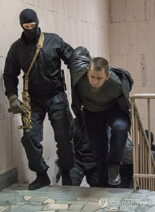 | △ 법정으로 호송되는 넴초프 살해 용의자 (AP=연합뉴스) 러시아 야권 지도자 보리스 넴초프 살해 용의자 중 한 명인 타메를란 에스케르하노프가 8일(현지시간) 심문을 받기 위해 경찰에 의해 모스크바의 법정으로 호송되고 있다. |