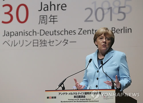 | △ 메르켈 총리가 도쿄 도내 아사히신문 본사에서 이 신문사와 사단법인 '베를린 일·독센터'가 공동주최한 강연에서 연설하고 있다. (FPA=연합뉴스) |