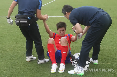 | △ 2015 AFC 호주 아시안컵 조별리그 A조 1차전 한국 대 오만 경기. 이청용이 경기 중 부상해 의료진의 부축을 받고 있다. << 연합뉴스DB >> |