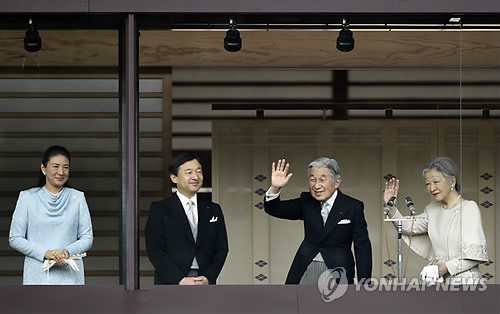 | △ 2015년 1월 2일 신년 축하 행사에 나선 아키히토 일왕(왼쪽 세번째) 부부와 나루히토(왼쪽 두번째) 왕세자 부부 (EPA=연합뉴스 DB) |