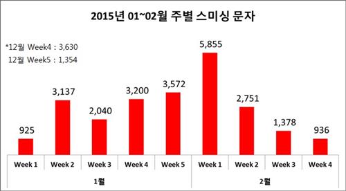 이후 명절이 포함된 2월 셋째 주에는 1천378건으로 많이 감소했다. 신년을 앞둔 2014년 12월 넷째 주에도 비교적 높은 수치인 총 3천630개의 스미싱 문자가 수집됐다가 새해가 시작된 주에는 총 2천279개로 전주 대비 약 37% 감소한 바 있다.