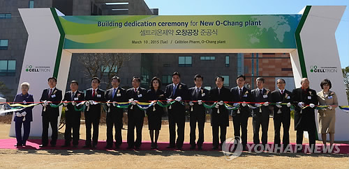 | △ 셀트리온제약 오창공장 준공식 (서울=연합뉴스) 10일 충북 청주시 오창읍 바이오산업단지 내에서 열린 '셀트리온제약 오창공장 준공식'에서 참석 내빈들이 테이프 커팅을 하고 있다. 1천500억 원을 투입해 대지 8만5천737㎡에 연면적 3만8천440㎡ 규모로 건설한 오창공장은 연간 100억 정의 정제와 캡슐제제 등을 생산하는 화학의약품 생산공장으로, 단일제형 생산공장으로는 국내 최대 규모다. 2015.3.10 << 셀트리온 제공 >> photo@yna.co.kr |