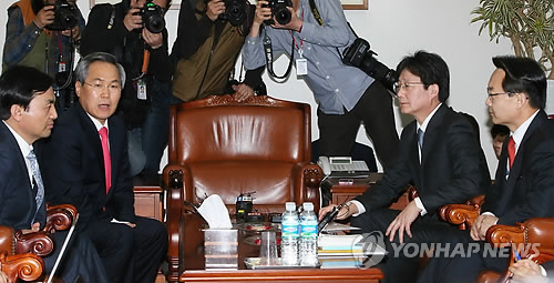 | △ 주례회동하는 여야 원내대표 (서울=연합뉴스) 진성철 기자 = 새누리당 조해진 원내수석부대표(오른쪽 부터), 유승민 원내대표와 새정치민주연합 우윤근 원내대표, 안규백 원내수석부대표가 10일 국회 운영위원장실에서 열린 주례회동에서 대화하고 있다. |