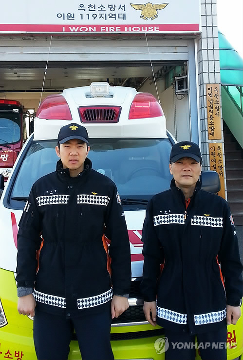 | △ 베트남 새댁 응급차 출산 도운 구급대원 (옥천=연합뉴스) 박병기 기자 = 지난 10일 119구급차 안에서 베트남 출신 새댁의 출산을 도운 충북 옥천소방서 이원지역대의 곽찬표(41·오른쪽) 소방교와 문주현(28) 소방사. 2015.3.11 <<옥천소방서 제공>> bgipark@yna.co.kr |