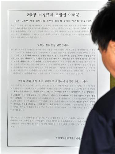 11일 현대차 울산공장 게시판에는 '2공장 비정규직 조합원 여러분'이라는 제목의 대자보가 이상수 전 울산비정규직노조 지회장 이름으로 붙었다.