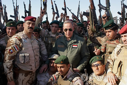 | △ 이라크 국방장관, 티크리트 탈환전 사령부 방문 (AP=연합뉴스) 칼리드 알오베이디 이라크 국방장관(가운데)이 7일(현지시간) 살라후딘주 사마라의 군 사령부를 방문, 장병들과 함께 포즈를 취하고 있다. 이라크 군은 이곳에서 얼마 떨어지지 않은 살라후딘주 주도이자 사담 후세인의 고향인 티크리트를 수니파 극단주의 무장세력 '이슬람국가'(IS)로부터 탈환하기 위해 시아파 민병대와 친정부 수니파 전사의 지원 아래 대규모 군사작전을 벌이고 있다. marshal@yna.co.kr In this Saturday, March 7, 2015 photo, Iraqi Defense Minister Khalid al-Obeidi, center, surrounded by soldiers, as they pose for a group photograph at the Iraqi Army headquarters in Samarra, 60 miles (95 kilometers) north of Baghdad, Iraq. Backed by allied Shiite and Sunni fighters, Iraqi security forces on Monday began a large-scale military operation to recapture Saddam Hussein's hometown from the Islamic State extremist group, state TV said, a major step in a campaign to reclaim a large swath of territory in northern Iraq controlled by the militants. (AP Photo) |