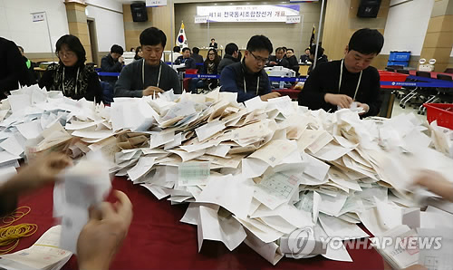 | △ 전국동시조합장 선거 개표 (춘천=연합뉴스) 이상학 기자 = 제1회 전국동시조합장 선거일인 11일 오후 강원도 춘천시 석사동 도여성가족연구원에서 선관위 직원들이 개표 작업을 진행하고 있다. |